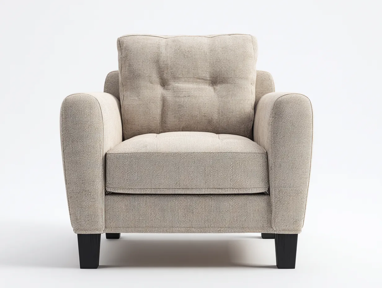 Obicie wykonano z tkaniny w kolorze beżowym o wyraźnej strukturze, która nadaje meblowi przytulny wygląd i dobrze prezentuje się w codziennym użytkowaniu. Korpus ma stabilną konstrukcję, a nogi z drewna w ciemnym wybarwieniu podkreślają proporcje bryły i zapewniają odpowiednie podparcie. Miękkie wypełnienie oparcia i siedziska poprawia wygodę podczas dłuższego użytkowania.