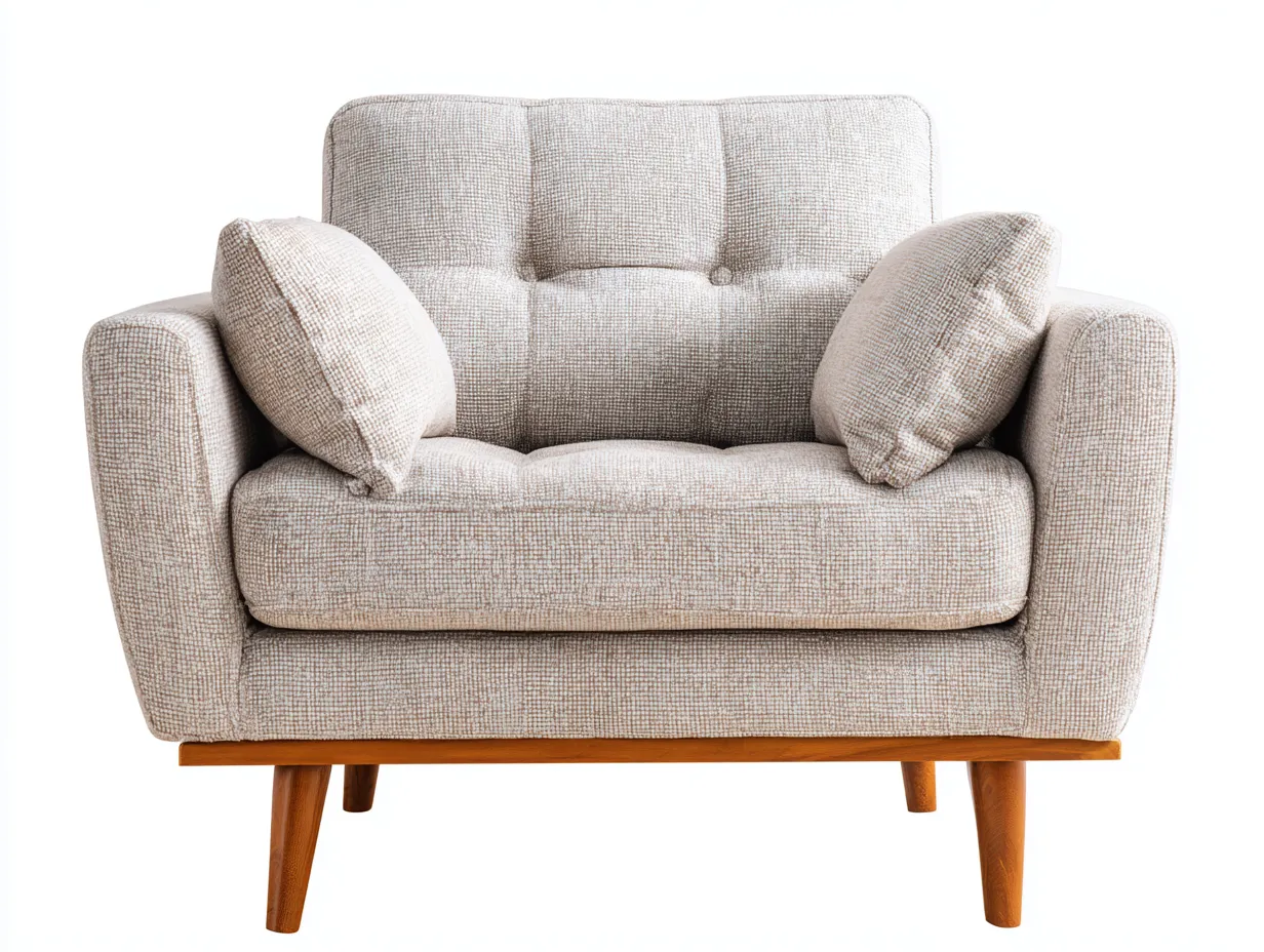 Obicie wykonano z trwałej tkaniny w kolorze beżowym, która dobrze sprawdza się w codziennym użytkowaniu. Konstrukcja została osadzona na solidnej podstawie, a nogi z drewna w ciepłym odcieniu nadają całości naturalny charakter. Wypełnienie siedziska i oparcia zapewnia odpowiednią sprężystość i wygodę.