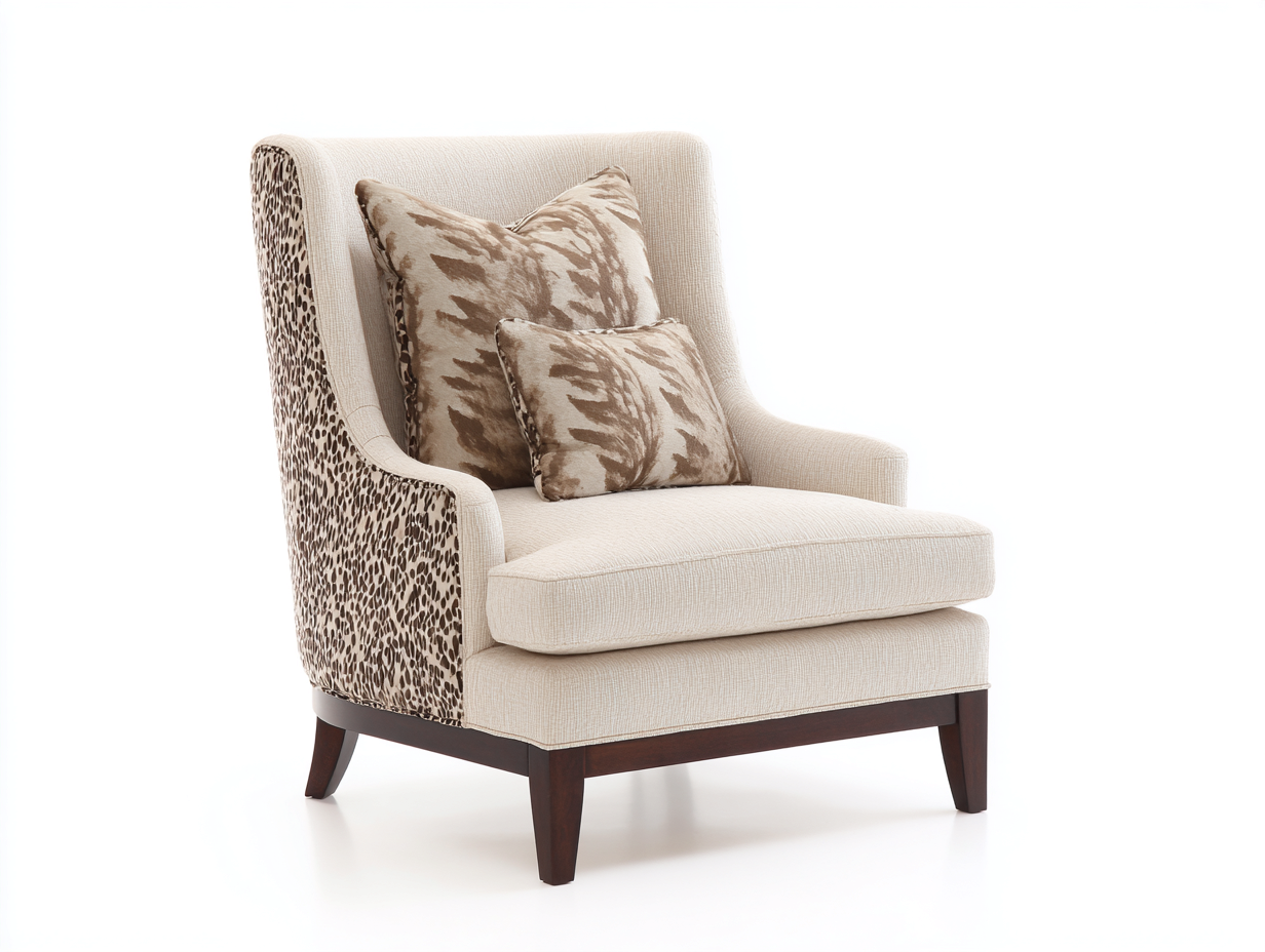 Obicie wykonano z tkaniny w kolorze beżowym, uzupełnionej wzorzystymi panelami bocznymi, które podkreślają unikalny wygląd mebla. Konstrukcja wsparta jest na solidnej drewnianej podstawie w ciemnym wybarwieniu, co zapewnia stabilność i trwałość. Wypełnienie siedziska i oparcia gwarantuje komfort użytkowania.