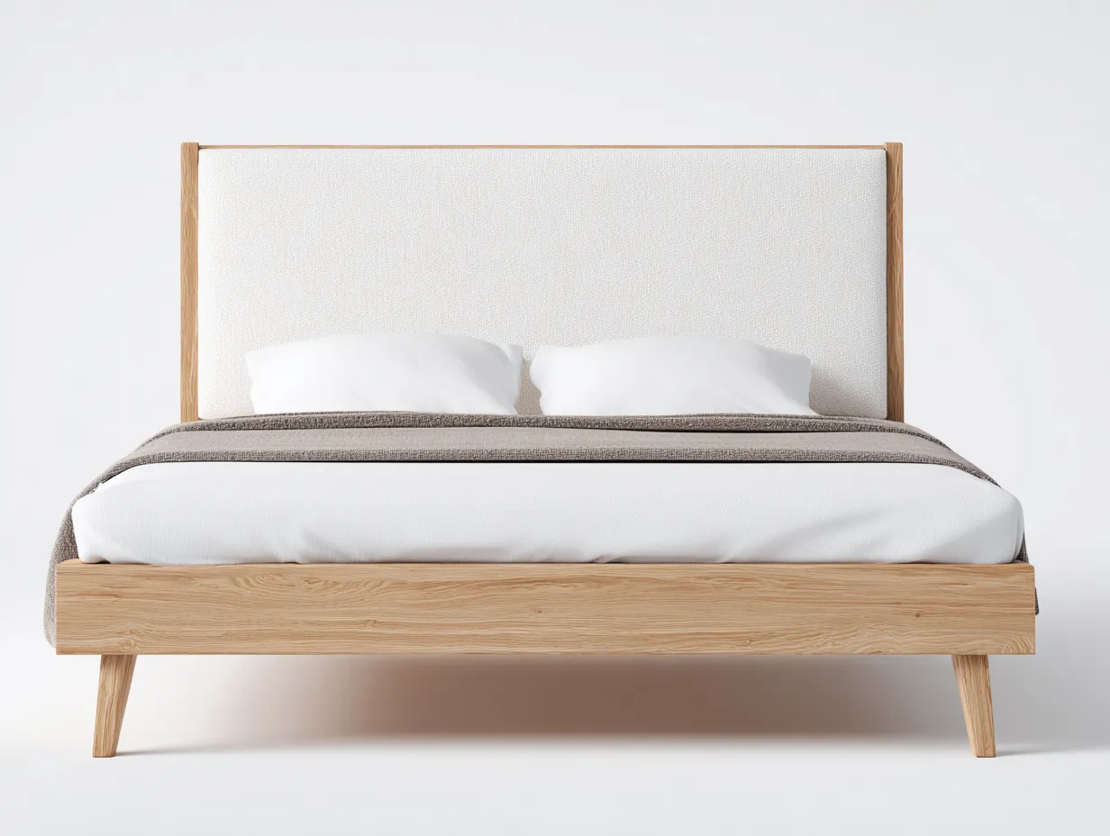 Łóżko dwuosobowe inspirowane stylem skandynawskim, łączące prostotę formy z naturalnym wyglądem materiałów. Stonowana kolorystyka oraz lekkie proporcje sprawiają, że model doskonale pasuje do nowoczesnych i przytulnych sypialni.