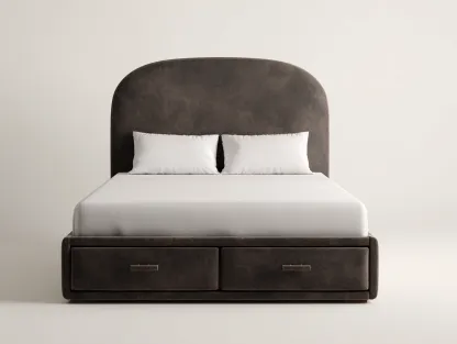 Łóżko dwuosobowe z tapicerowanym zagłówkiem i zintegrowaną strefą przechowywania zostało zaprojektowane do wygodnego użytkowania w sypialni. Zaokrąglona forma zagłówka nadaje całości spokojny i uporządkowany wygląd, a zabudowana podstawa pomaga lepiej wykorzystać przestrzeń.