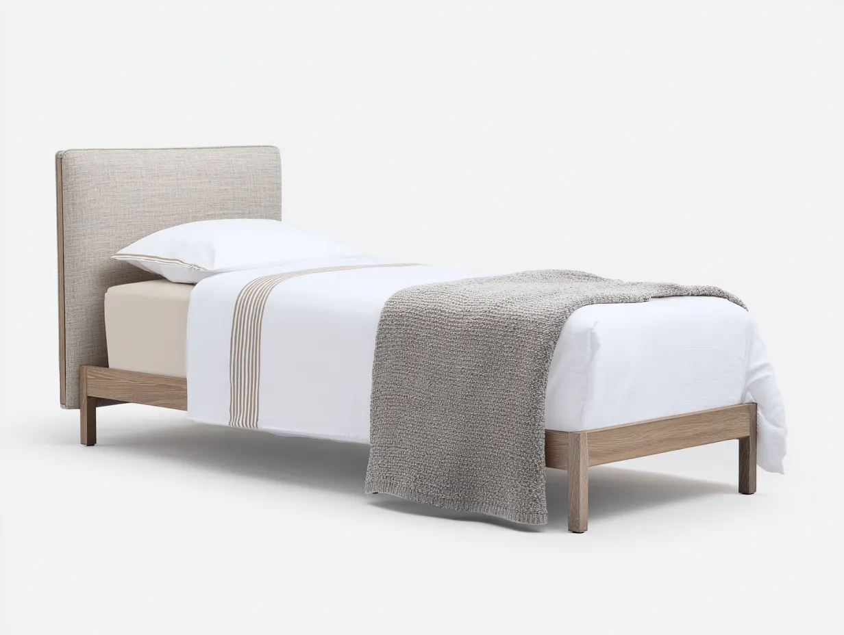 Łóżko pojedyncze o lekkiej i nowoczesnej formie, łączące naturalne drewno z elegancką tapicerką. Jasna kolorystyka sprawia, że doskonale wpisuje się w przytulne i harmonijne aranżacje sypialni.